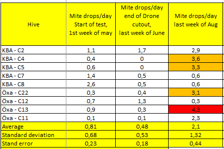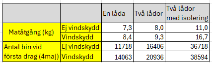 Om vi för över ovanstående till en bikupa behöver vi komma upp till R=10 på sidorna vilket motsvarar 50 mm cellplast eller 200 mm trä. Uppåt behövs R=30 vilket motsvarar 150 mm cellplast, se figur 5. Mätningar visar att bina i en välisolerad kupa håller temperaturen närmast klustret vid 6o C även om yttertemperaturen är -30o C vilket gör att bina sitter i ett löst kluster och kan röra sig fritt i kupan. Honungslagret hålls varmt och fungerar som ett energimagasin vilket jämnar ut kortvariga köldknäppar. Resultatet blir att bina kommer ut starkare på våren, figur 6, och är redo för första draget. Givetvis är behovet av isolering större ju kallare vintrar, men bra isolering under vinternkommer generellt hjälpa bina att komma ut starkare på våren, se figur 6.