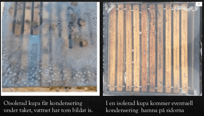 Vi börjar med begreppet ”daggpunkt” vilket betyder den temperatur då fuktig luft kondenseras till vattendroppar, se figur 2. Varje gång vi andas ut följer det med fukt, andas på en kall spegel så blir det uppenbart, och detsamma gäller bina. När bina förbränner sockerarter skapas stora mängdervatten där 1 kg honung ger upphov till ungefär 600 gr vatten (3) vilket bina på något sätt måste hantera. I en oisolerad kupa kommer fukten att kondensera på den ytan som ligger under daggpunkten vilket innebär att om taket är dåligt isolerat ökar risken för kondensering varvid vattendropparna rinner ner på bina och kyler av dem, figur 2.