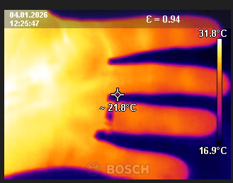 English summary: The web is flooded with IR-images pretending to show the cluster through the walls of the hives. From American movies we have learned that IR can see through walls easily, and perhaps there are some fance military stuff that can actually do that. But no commercial IR camera I know of have that possibility- they simply project an IR image of the surface, as can be seen in below pictures. One must check the heat gradient and as one can see in the right hive image the yellow color is -3 degree C. The IR camera cant even see through a sheet of paper as the hand images show, figur 2.