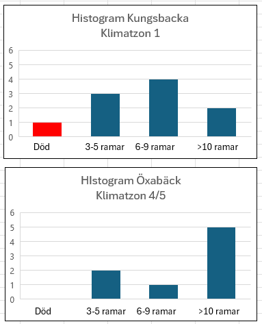 Vi har två bigårdar med helt olika klimatzoner där vår hemmabigård ligger i klimatzon 1 vilket ger milda och fuktiga vintrar. Vår skogsbigård ligger i Öxabäck där vi har klimatzon 4/5 med betydligt kallare, men också torrare, vintrar vilka är jämförbara med kusten upp till Sundsvall och Umeå. Vi upplever att bina har det tuffare i vår hemmabigård men har aldrig gjort något test. I år har vi gjort en jämförande studie med 8 och10 samhällen i Öxabäck respektive Kungsbacka de har invintrats på samma sätt och med ungefär samma bistyrka. När vi gjorde vårinspektionen fick vi följande resultat i Kungsbacka: 1 vinterförlust, 3 svaga (5 ramar bin), 4 normalstarka (7-8 ramar med bin) samt 2 uberstarka (>10 ramar). I Öxabäck har vi 2 svaga samhällen, 1 normalstarkt och 5 uberstarka. I figuren nedan ser vi att histogrammen tydligt pekar på bättre övervintring i den kalla men torra vintern i Öxabäck.