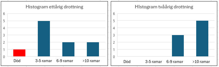 English summary: We have two apiaries, one in a mild coastal climate and one in a bit more harsch inland climate. We tend to see that the humid coastal climate give worse overwinters of the bees so the hypothesis for this test is that a dry cold climate is better than a mild and wet for overwinter results. In the first histogram we can see that the cold climate in Öxabäck gave far better winter results (most colonies are strong) than the wet climate in Kungsbacka where we have some strong but also some weak ones. However, if we instead use the age of the queens (2nd histogram) then we see a clear pattern that the one year queens seem to have issues where the two years gave strong colonies regardless of the apiary. One year queens origin from nuc’s or swarms and due to the bad flow last summer they struggled to find enough food, resulting in poor development over the season as well as too little honey for the winter period, thus we had to give more sugar to those. The older colonies were much bigger and managed to collect much more honey and pollen and this is probably the reason for the better performance of the 2 year old queens. It shows how important it is to challenge your results and that tests must be repeated to avoid faulty conclusions.