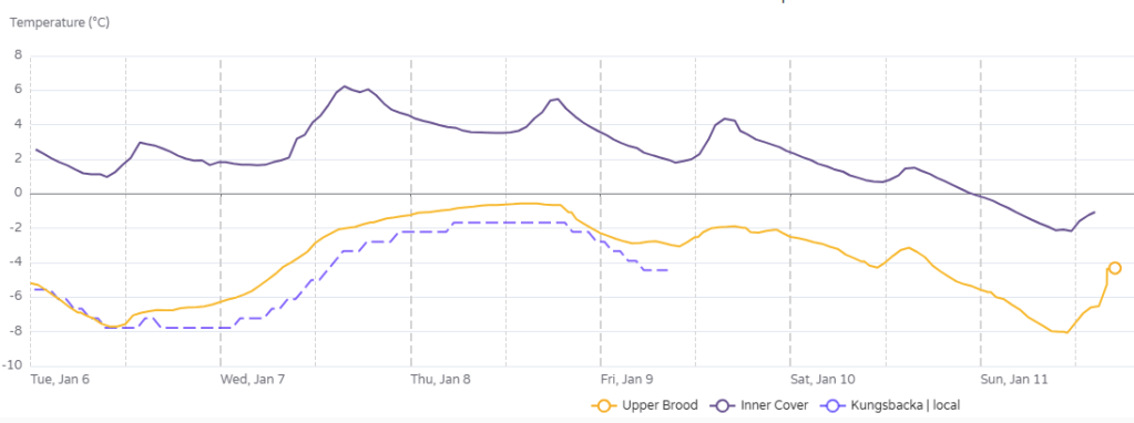 Hur som helst, ett av våra samhällen har haft låga temperaturer, figur 1, vilket indikerar att samhället är dött eller möjligen har en handfull bin kvar varför vi tog in samhället i källaren för att undersöka hur det står till.