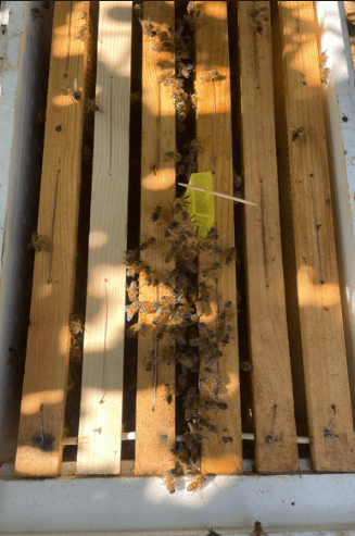 Ett av våra samhällen hade vid första inspektion i början av mars väldigt lite med bin, och vid kontroll förra veckan var drottningen nästan ensam i kupan – goda råd var nu dyra. Vi burade raskt drottningen tillsammans med några överlevare (lite sockerpasta i buren), och plockade fram en av våra 6 ramars avläggare där vi tog en ram med bin från det starkaste samhället tillsammans med en honungsram och en pollenram. Därefter satte vi in drottningen och ställde in kupan i garaget eftersom det fortfarande är kallt på nätterna. Vi släppte ut drottningen i söndags, och i dag bar vi ut kupan och ställde den på samma ställe som originalkupan stod, öppnade och kunde konstatera att hon spatserade lugnt bland sina nya undersåtar. Vi kommer fortsätta att förvara kupan inomhus på nätterna till dess nattemperaturerna stabiliserar sig på plussidan.