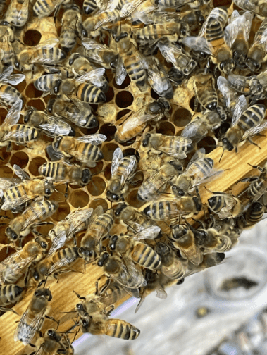 One of our colonies was very weak and during inspection last week there were very few bees left. The queen were still alive so we had to find a quick solution to save her and hence we caged her with a few of the survivors and placed her in a 6 comb hive. We took a comb with bees from our strongest colony and placed them in the ini hive together with honey and pollen. We closed the hive and placed it in our clellar since night temperatures are still below zero degree C. On sunday we released the queen and during todays inspection we found her walking calmly around her new court so it seems the “panic rescue” was successful.