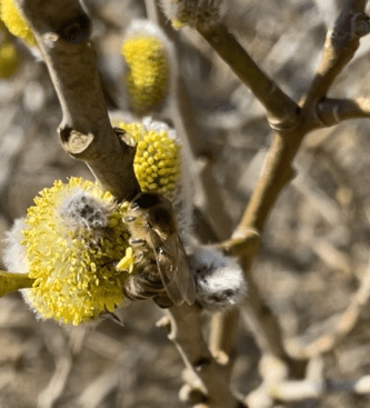 Igår skulle jag stödmata ett par samhällen i Öxabäck och insåg, när jag öppnade, att där fanns nydragen honung. Idag letade jag rätt på en sälg i solläge och, minsann, där var det fullt pollendrag. Eftersom sälgen är tvåbyggare är det rimligt att anta att även honträdet blommar.
