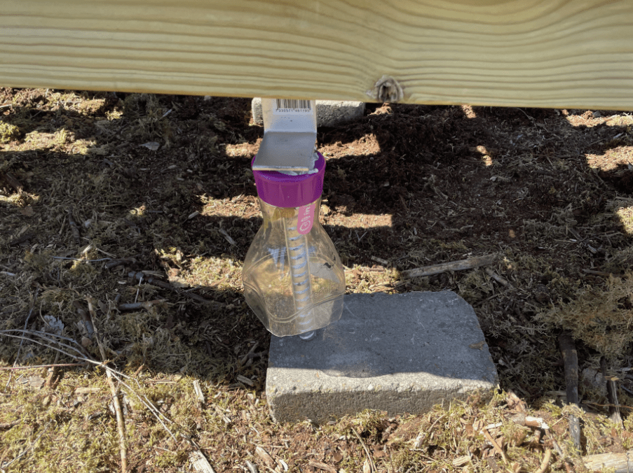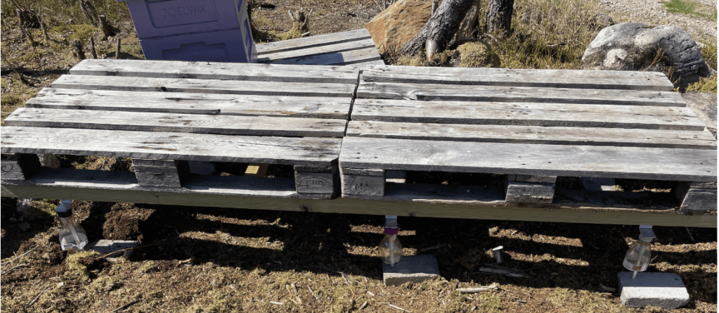 I en av våra bigårdar har vi fått invasion av stackmyror, vilka är betydligt värre än svartmyrorna. Svartmyror brukar vi låta vara eftersom de aldrig brukar ta sig in i kuporna medan stackmyrorna, däremot brukar ta sig in kuporna. Vi har därför byggt denna ställning med labyrintfot där myrorna tvingas ta sig igenom en labyrint med fett som stopp, se bilder nedan.