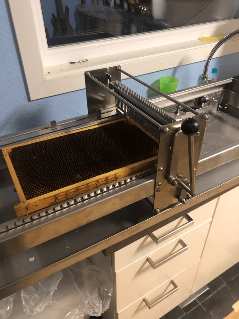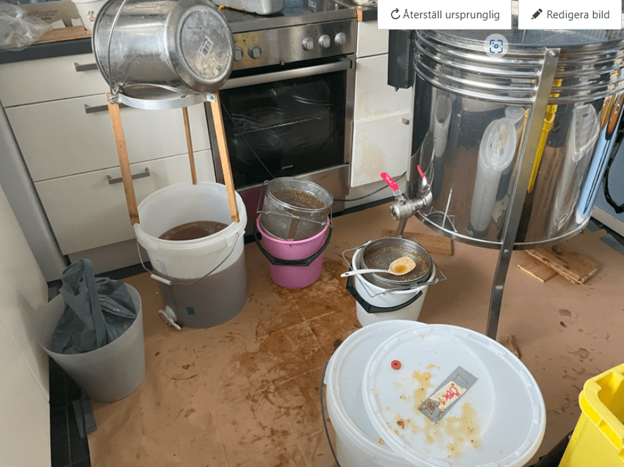 Så kommer vi till kvalster behandlingen där vi har kört vår egna metod med drönarutskärning och mjölksyra vid behov under augusti-oktober och där vi bara tar till myrsyra på hopplösa fall där nedfallet ökar drastiskt. Får vi nedfall över 6-7 per dag har vi ett potentiellt problem och då räknar vi kvalster i arbetercellerna – vi skär ut ca 100 celler, fryser dem samt räknar antal kvalster och får därmed angreppsgrad vilket säger oss hur många kvalster som gömmer sig och kommer välla ut om en vecka eller så. Mer än 700 kvalster i ynglet (0,05×15000 till exempel) kan vi inte tillåta och då blir det myrsyra. Myrsyra dödar tyvärr en del yngel och vuxna bin, vilket vi får leva med, men dessvärre dör också en del drottningar emellanåt och det kan vi inte leva med. Därför lyfte vi av matlådan, innan vi applicerade wettexduken med 40 ml 60% myrsyra, och placerade drottningen där (vi stänger flustret och låter henne sitta där i två dagar) så hon slipper den värsta chocken och dessutom undviker vi att kontaminera honungen som bina ska leva av. Vid koll igår såg det bra ut i skattlådan lådan l(vi såg nylagda ägg) och idag sätter vi tillbaks lådan och tar bort spärrgallret. Om en vecka ser vi om det blev succe, men vi tror den här metoden är rätt väg för att undvika värsta problemen med myrsyra.