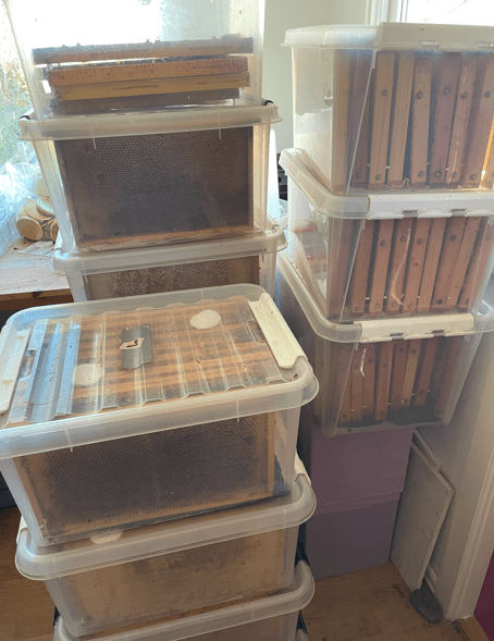 Nu börjar lugnet lägga sig i bigården och det mesta stöket är över. Vi ställer alla tomma ramar i lådor och sätter en burk med ättika för att hålla motten borta, när kylan kommer löser sig det av sig självt. Alla matramar ligger i insektstäta plastlådor med lite ättika och kommer användas i vår som stödmatning eller foder till avläggare. Sista draget hos oss brukar alltid vara vindruvorna som bina går på när de börjar skrumpna.