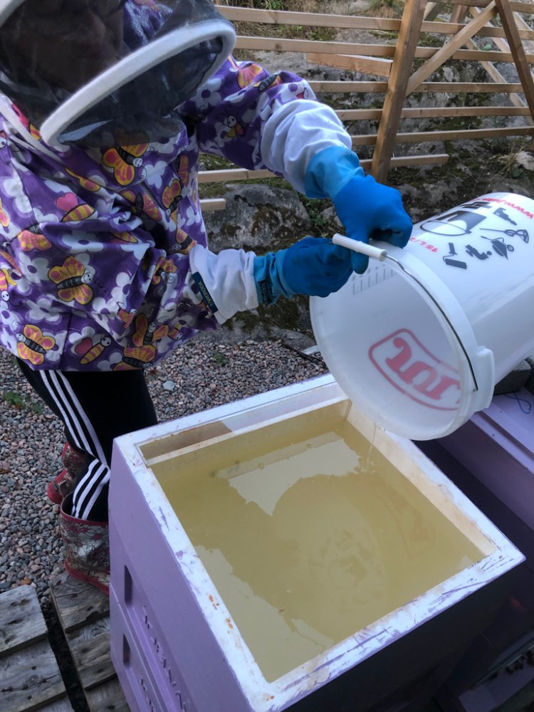 Så fyller vi på med sockerlösning (60%) motsvarande 12 kg torrsocker. Då vet vi att bina har rejält med foder oavsett hur sträng vintern blir eller om våren uteblir som i år. Tack vare två lådor så har bina gott om plats för fodret och de kan placera det som de vill, dvs i den övre lådan. Klotet kommer sen att börja i den undre lådan och så arbetar de sig uppåt vartefter fodret går åt.