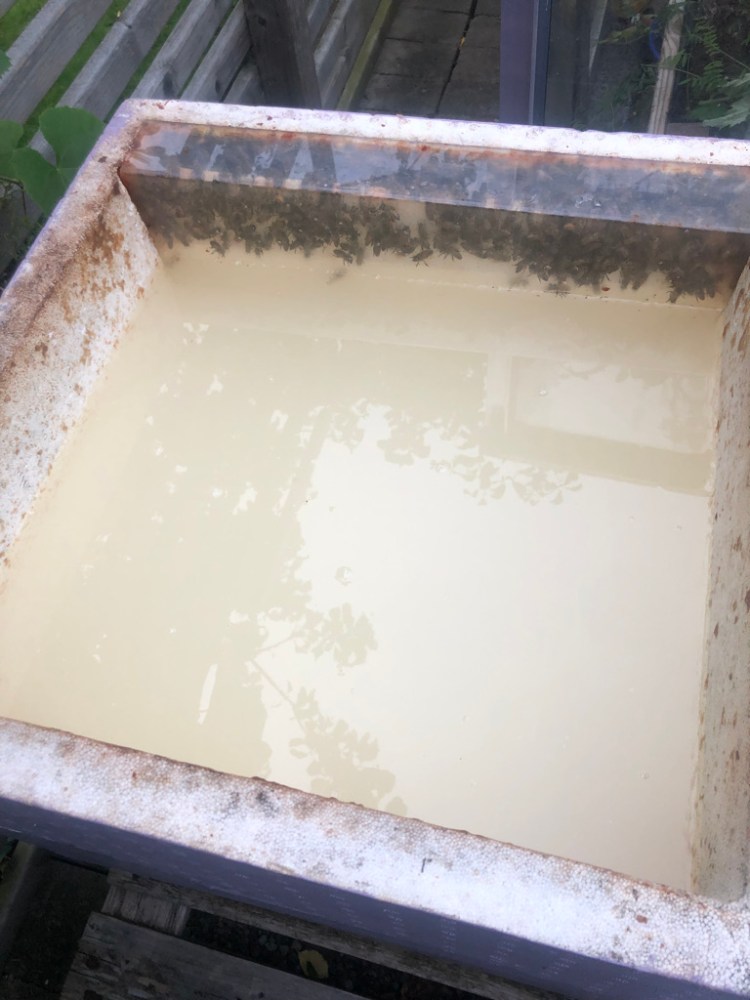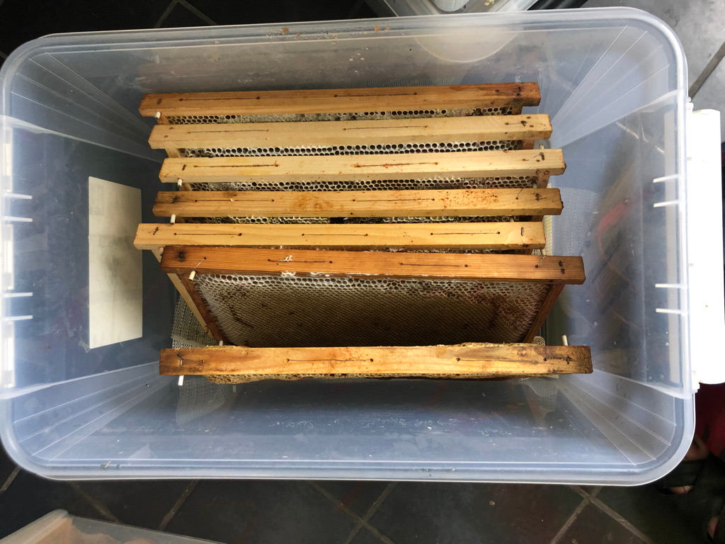 Tips 1: Viktigt att man använder plastbiten som det är tänkt – den stänger in bina så de inte kommer in i lådan och vätskan rinner in till dem. Lugnt och stilla för både oss och bina.