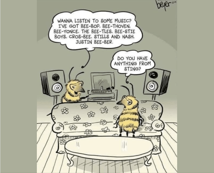14. What music do bees like? Bee-bop, Bee-thoven, Bee-yoncé, The Bee-tles, Bee-stie Boys, Cros-bee, Stills, Nash & Young, or Justin Bee-ber?