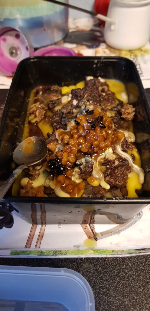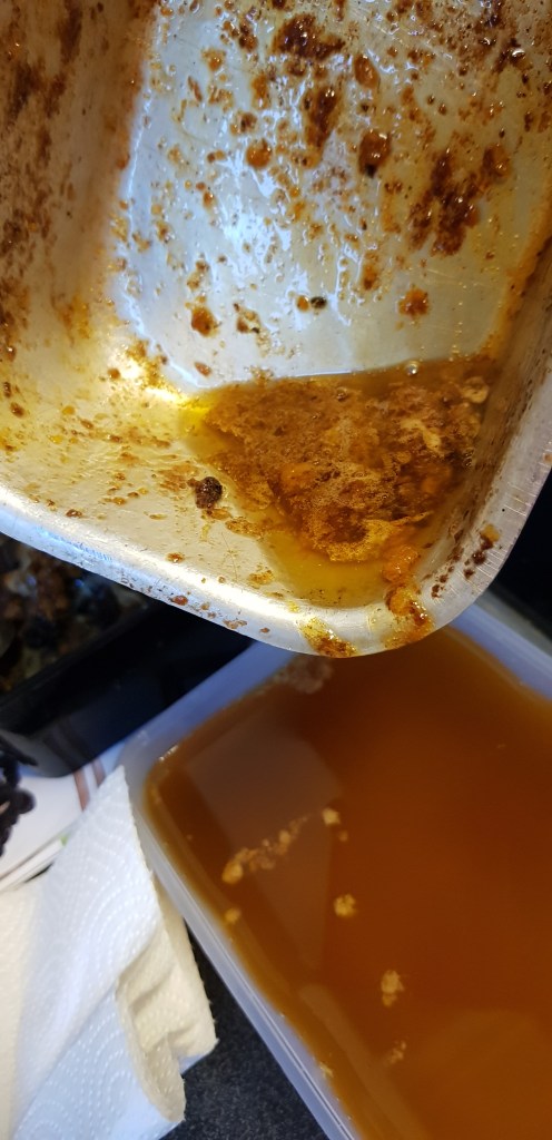 Byttan med smält vax är nu väldigt varm så ta det väldigt försiktigt. Jag viker några bitar hushållspapper så jag kan hålla i den och häller över i plastbyttor (t.ex. sådana som varit ris eller annat som inte ger smak). Klägget på botten häller jag över i skräpbyttan. Slutligen använder jag en av hushållspappersbitarna till att torka ur byttan.