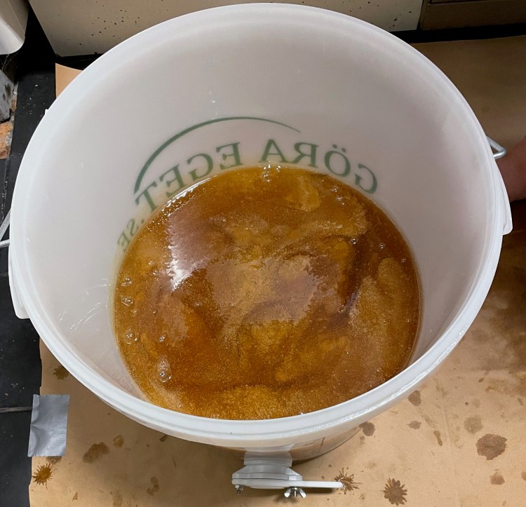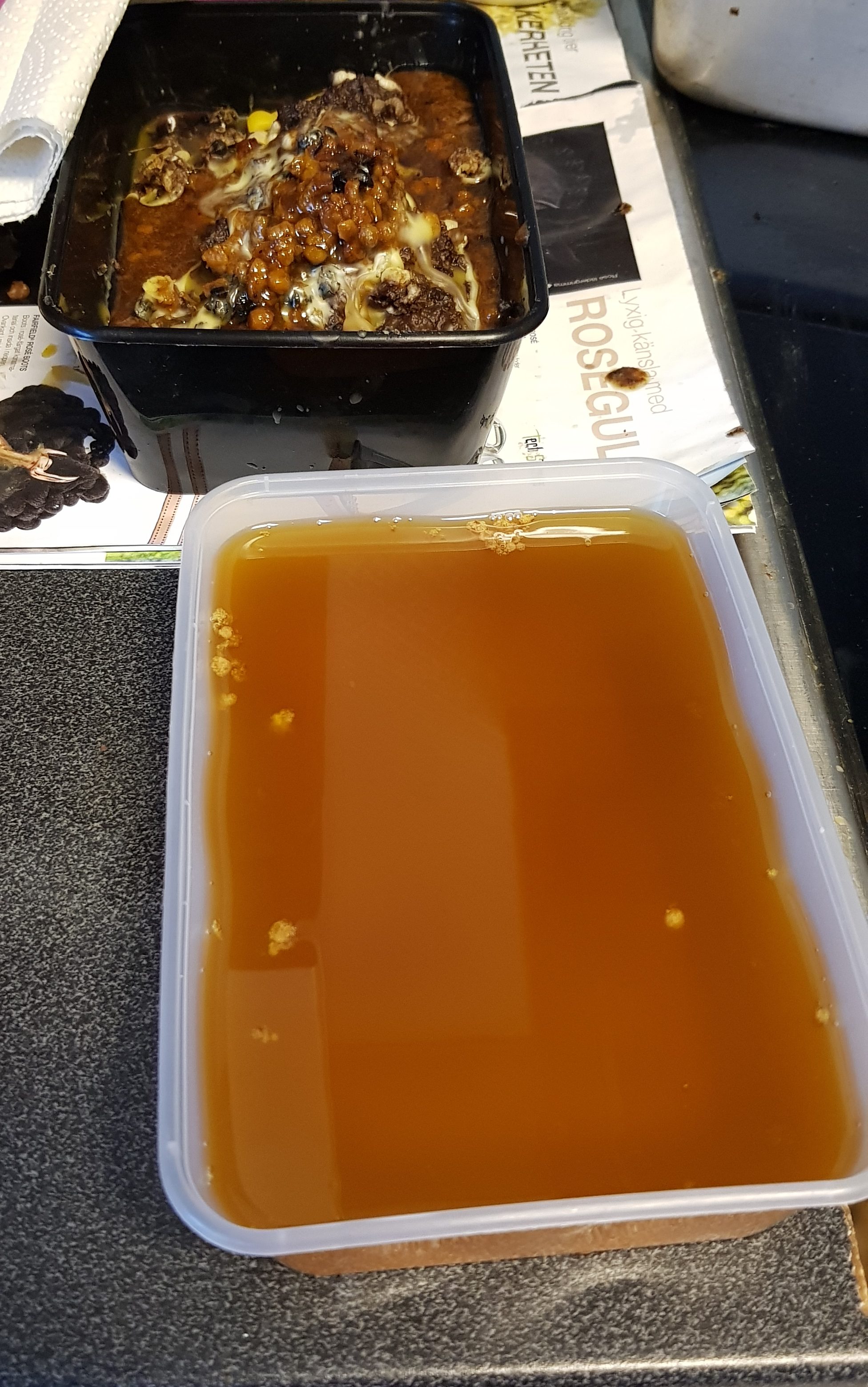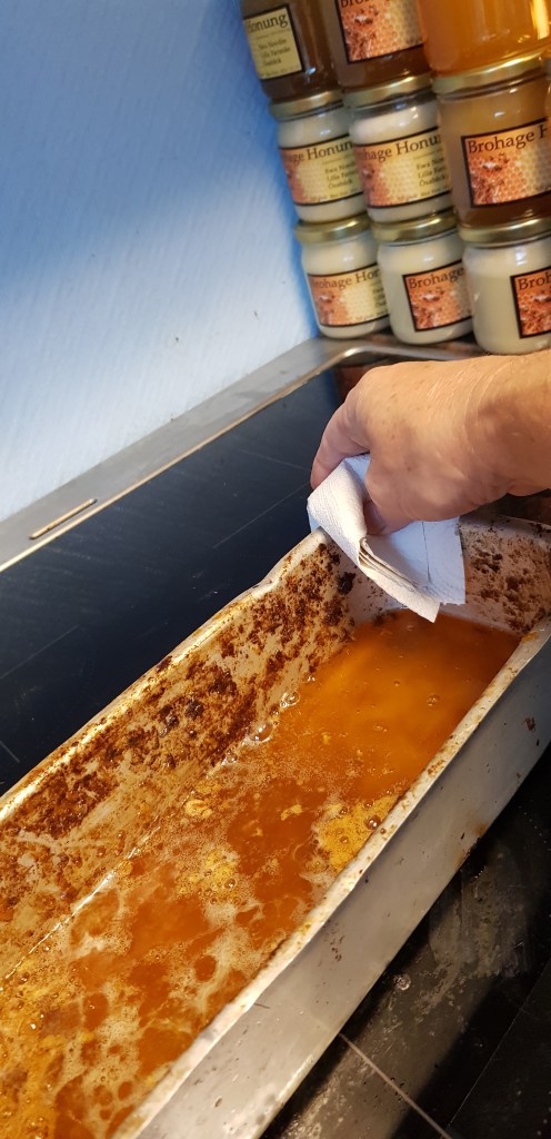 English summary: After a period with scarce nectar flow we suddenly found plenty of pitch dark honey in the hives with a very distinct taste of “caramell”. We were expecting a bit of light Linden honey but the bees have instead found some exclusive honey dew!