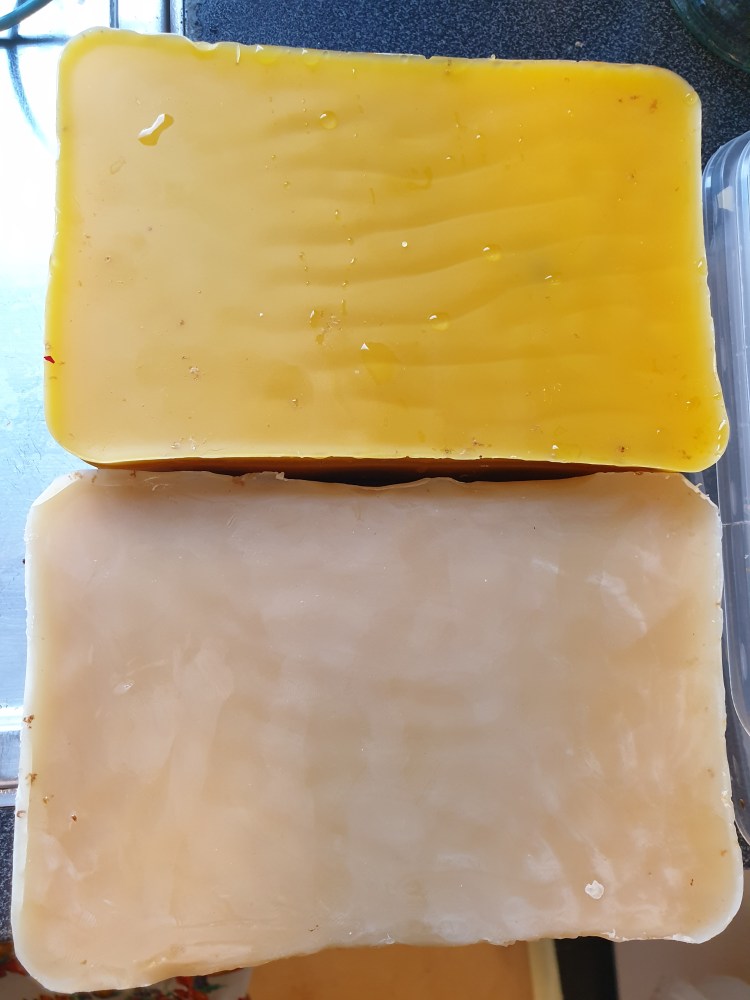 Så här fint ser det ut när man hällt över det i plastbyttan. Bilden till höger visar färdiga vaxblock.