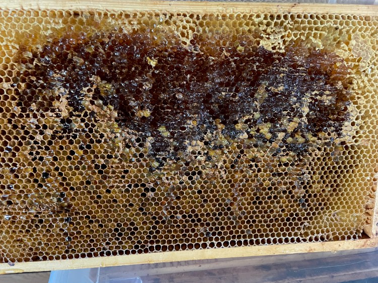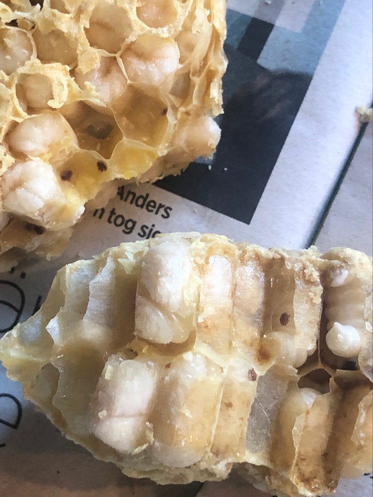 Drönarperioden har också slutat tidigare än normalt och alla kuporna har nu slutat bygga ut drönarramen vilket är 2-3 veckor för tidigt. Det innebär tyvärr att vi har fått lite mindre data än vi hoppats på för vårt test där vi trots det har fått många indikationer på att bina verkligen städar bort drönarceller med kvalster – 50-60% urstädning har vi sett. Kan mycket väl vara högre än så eftersom vi har skurit ut kakorna några dagar innan drönarna är redo att krypa ut och bina kanske städar hela vägen till att cellerna öppnas. Var det sen betyder får vidare tester utvisa: