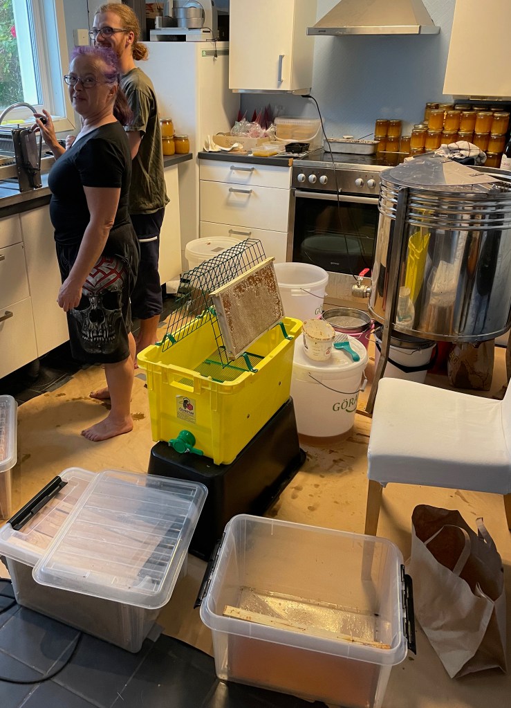 Nu är det snart dags för Ljunghonung som verkar vara en vattendelare bland oss biskötare – somliga älskar den och somliga hatar den. Första gången vi skulle försöka få ur honungen använde vi potatispressen. Höll på en hel kväll och köket var fullständigt nersölat. Till slut hade jag fått ur en liten burk honung och så blev det dags för provsmakning – jag gillade inte eländet överhuvudtaget. Där och då svor jag att aldrig mer skola ljung komma innanför våra dörrar så vi har invintrat början av augusti bara för att slippa ljungen.