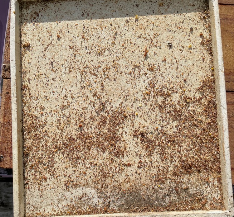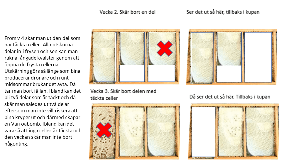 Har vi skött drönarutskärningen på rätt sätt har vi troligen lågt nedfall/population så där brukar det vara lugnt men vi kollar förstås varje vecka att nedfallet håller sig under 3/dag (>21 på en vecka). Sedan lyfter vi av skattlådan och man känner på tyngden om där är tillräckligt och skulle den vara för lätt kollar vi efter honung i yngellådorna. Finns det tillräckligt så vi bedömer att de har 5 ramar gör vi inget men är det för lite så sätter vi till ramar i skattlådan. Vi sätter nästan alltid honung i skattlådorna eftersom det är lättast att bedöma mängd där men också för att se till att det finns plats för yngel eftersom vi vill att de ska fortsätta sätta mycket yngel hela juli. Därefter kollar vi att det finns nylagda ägg och så fort vi hittat sådana är vi i princip klara och en sådan här genomgång tar ca 5 m om allt är väl. Skulle det bli ett plötsligt drag – tex Lind blommar vanligtvis i Juli så skattar vi förstås överskottet men vi spar, som sagt var, alltid minst 5 ramar i kuporna. Från svagare samhällen brukar vi aldrig ta något utan vi låter dem behålla allt och förhoppningsvis får de ihop till sin vintermat. En ytterligare fördel med att ha minst 5 ramar är att ifall vi inte har tid eller vädret är dåligt så gör det inget om det blir två veckor mellan genomgångarna så här års – maten räcker oavsett i minst två veckor. När vi kommer till slutet av Juli kan kvalsternedfallen börja öka och då sätter vi in mjölksyran. Idealiskt kommer vi då att kunna detektera att de kupor som verkade städa ur kvalsterceller verkligen har resistans, men mer om det senare.