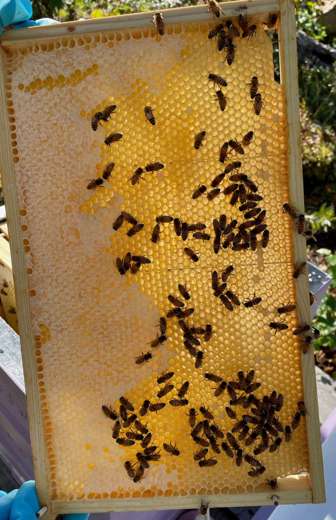 I en koloni såg vi plötsligt viseceller och då gäller det att inte få panik och börja riva celler. Efter koll såg vi att det bara fanns ett par stycken och rätt dåligt med nylagda ägg så vi är rätt säkra på att det är ett stilla byte så vi låter bina sköta det själva och gjorde inget alls. I övrigt så går veckokollen så här års enbart ut på att kolla att där finns mat samt nylagda ägg vilket bara tar 3-4 minuter per kupa.