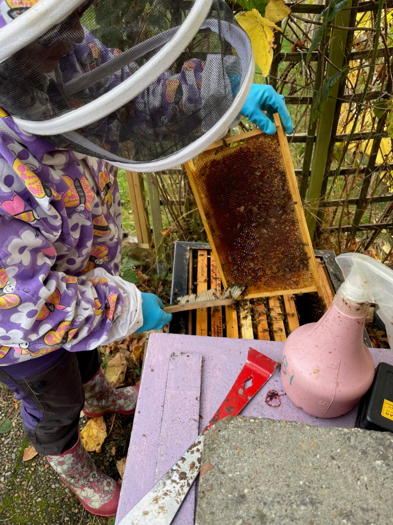 Först plockar vi av skattlådan, ifall den fortfarande är på, och vi invintrar alltid på två lådor för det är bäst för bina och lättast för oss biskötare.