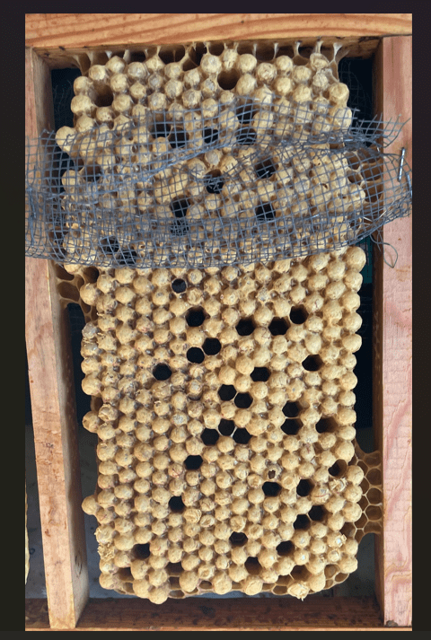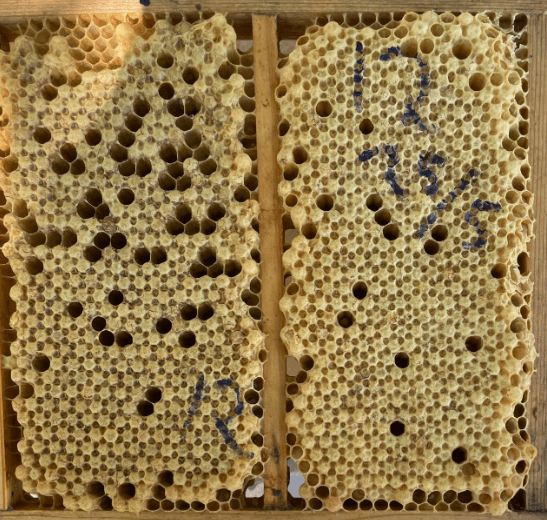 De gamla cellerna har flera hål där bina eventuellt rensat ur larver med kvalster
