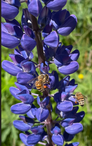 Nu får vi betala priset för den tidiga blomningen då det är knappt om mat, speciellt i vår skogsbigård där samtliga kupor utom en behövde få extra matramar. Vi hade med oss 6 ramar honung som vi fördelade så att alla hade 4 ramar som minst. Lupinerna kom för ett par år sedan och har nu spritt sig hejdlöst och fullständigt tagit över vägrenarna men de verkar ge bra med pollen så helt värdelösa är de inte.