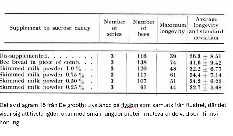 Då återstår frågan om äldre bin klarar sig på enbart kolhydrater. DeGroot (3) fann i sin studie att livslängden för både unga bin och äldre bin ökade signifikant när bina fick proteiner motsvarande vad som finns i pollen men att mängden som de äldre bina behövde var markant lägre än vad de unga bina behövde. Dessutom, äldre bin avstod från att äta rent proteintillskott utan föredrog att äta sockerlösning innehållande protein. Mängden protein som behövdes för att hålla proteinnivåerna konstant låg på nivåer motsvarande vad som finns i honung, se tabell nedan. Tabellen visar också att äldre bin som levt på enbart socker får ökad livslängd om de får pollen.