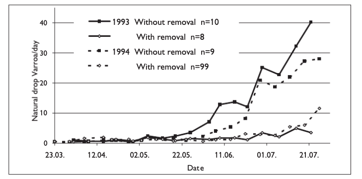 I en annan studie av Charriere et al (3) som utfördes under två år fick man liknande resultat på kvalsternivåerna, se fig 3. Man fann även att kolonin i övrigt inte påverkades negativt av drönarutskärning där totala antalet producerade ägg var lika med eller utan drönarutskärning, ca 140000 ägg på en säsong. Noterbart är att de gjorde färre utskärningar under 1994 än 1993 men med samma antal utskurna drönare. Kurvan för nedfall stiger 1994 brantare efter avslutad utskärning vilket indikerar att antalet utskärningar är viktigare än totala antalet utskurna celler, se den nedre streckade linjen i fig 3 nedan. Däremot fann man ingen påverkan på honungsproduktionen i denna studie.