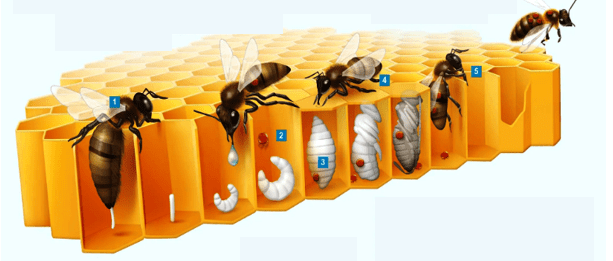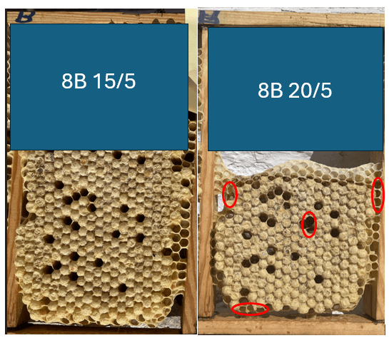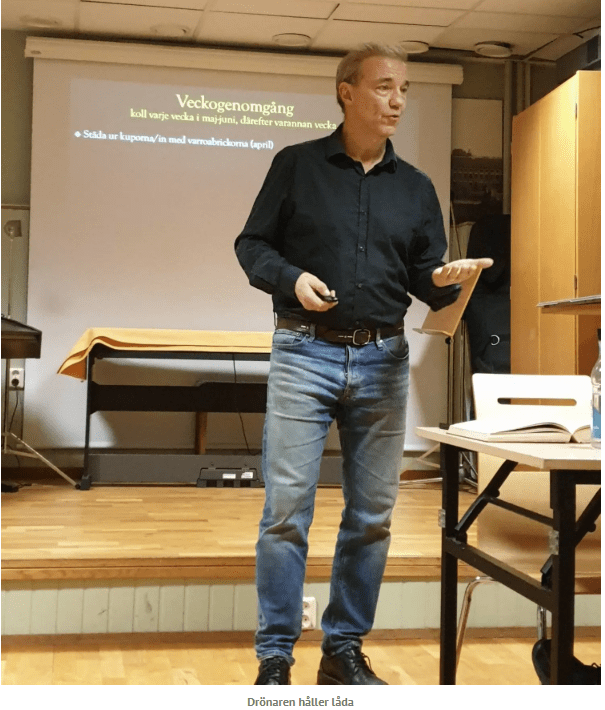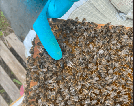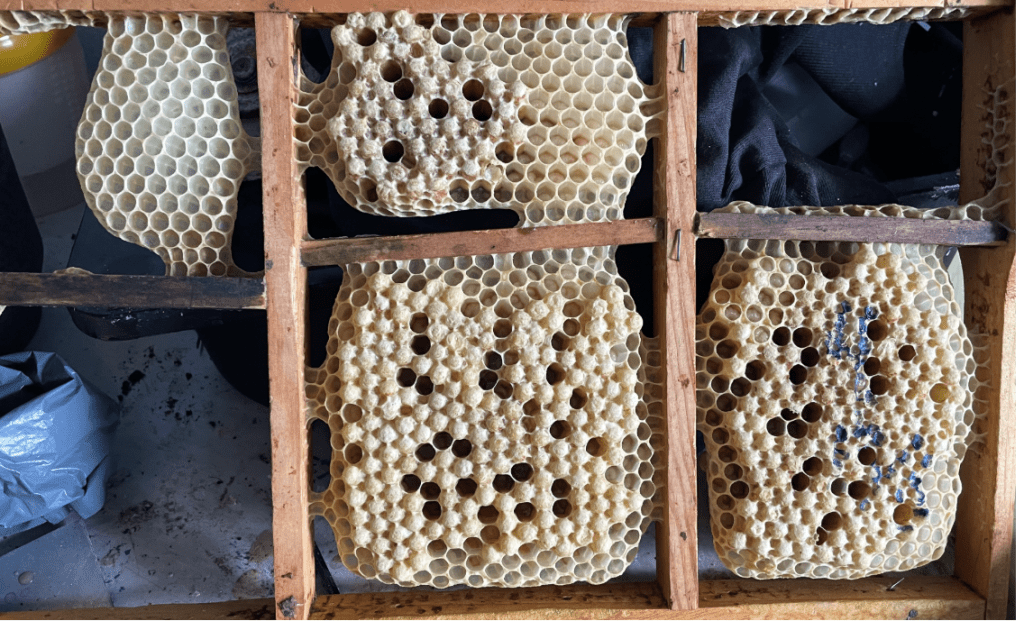 Svärmen vi tog in hade uppenbarligen en gammal drottning då de redan efter en vecka aviserade stilla byte. Eftersom det var glest med yngel generellt var det rätt glasklart att det var stilla byte och inget annat. Hur som helst – de gjorde en 6-7 viceceller och då passade vi givetvis på att göra en avläggare genom att skära ut två fina viseceller. De övriga satt dumt till så det fick räcka med en avläggare. På bilden nedan har vi nålat fast den utskurna delen med två drottningar och satt i en liten avläggare med en ram med bin samt honung och lite pollen. Med lite tur klättrar de ut på torsdag eller fredag.