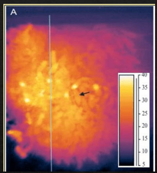 När temperaturen sjunker börjar samhället dra ihop sig och vid minus 15˚C är mantelns isolerande skikt endast några cm tjock tack vare binas goda isolering, bild 3. Värmefördelningen visas i fig 5 där man tydligt ser att bina i manteln är svalare än bina i kärnan och eftersom värme går från varmt till kallt betyder det att mantelbina får värme från kärnan och inte tvärtom. Mantelbina producerar mängder av värme men den räcker nätt och jämnt för att hålla biet över “komatemperaturen” och deras uppgift är att isolera kärnan. Bina i kärnan kan röra sig relativt fritt och tar hand om drottningen (pilen) på samma sätt som de gör på sommaren. Endast några få bin behöver skapa extra värme för att höja kärnans temperatur från 20-25 ˚C (normalfallet) till 34-35 ˚C när det är dags att sätta yngel.